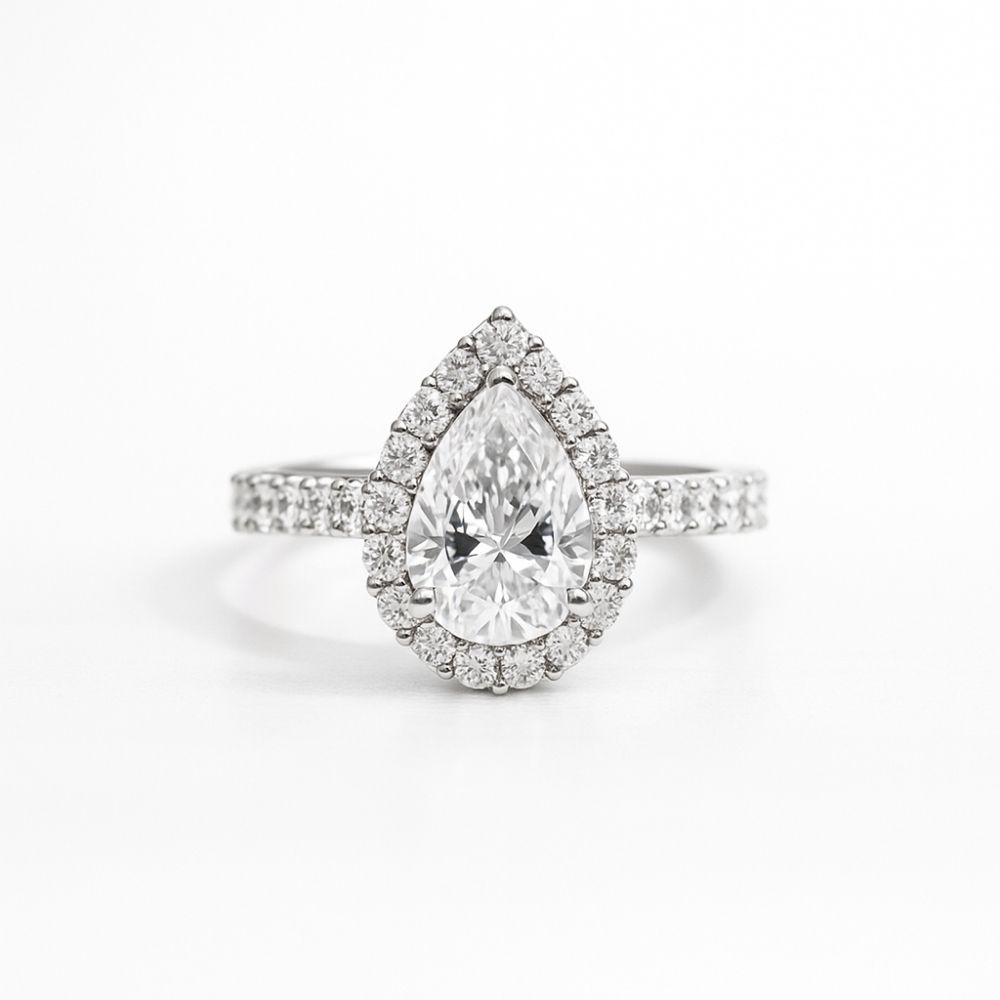 A pear-shaped centre framed by a fine halo on a diamond-set band.