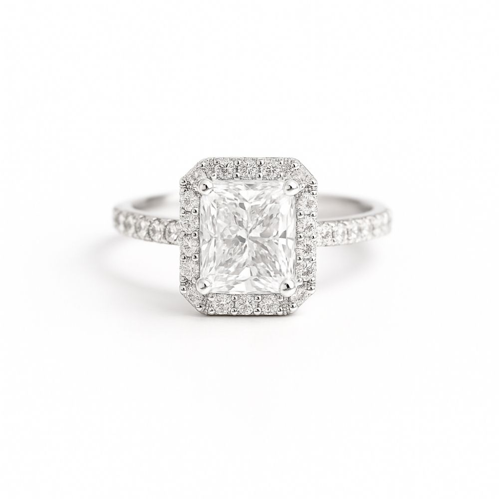 Modern geometry, brilliant sparkle. The radiant-cut centre is secured by neat claws and surrounded by a fine halo for extra brightness and size. A slim pavé band completes the look—sleek, flattering and effortlessly wearable.