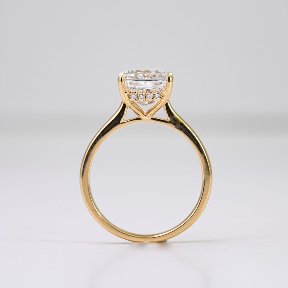 - Setting: Four talon claws with hidden pavé halo on the gallery/bridge