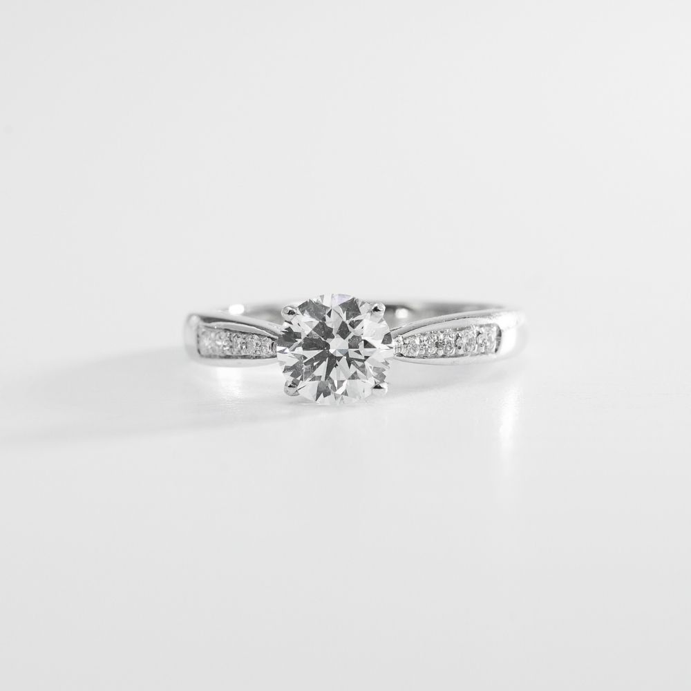 A round brilliant in a four-claw head with pinched pavé shoulders.