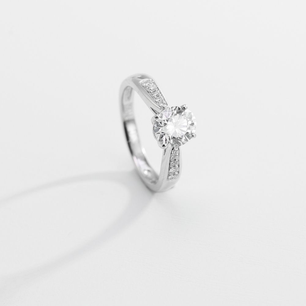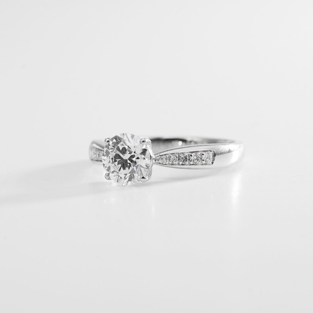 Clean geometry with a touch of sparkle. The round brilliant centre sits in a refined four-claw setting, while slim pavé shoulders pinch towards the head for a modern, sculpted silhouette that flatters the finger. A polished comfort-fit band keeps it sleek and wearable—elegant without fuss.