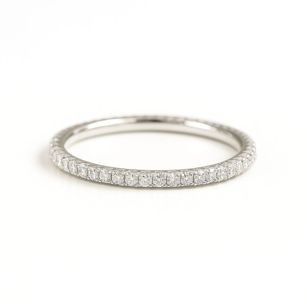 A timeless essential. This slender band is set with round brilliant diamonds in classic pavé for a continuous 360° shimmer. Low-profile and smooth inside for everyday comfort—beautiful solo, with a solitaire, or stacked.